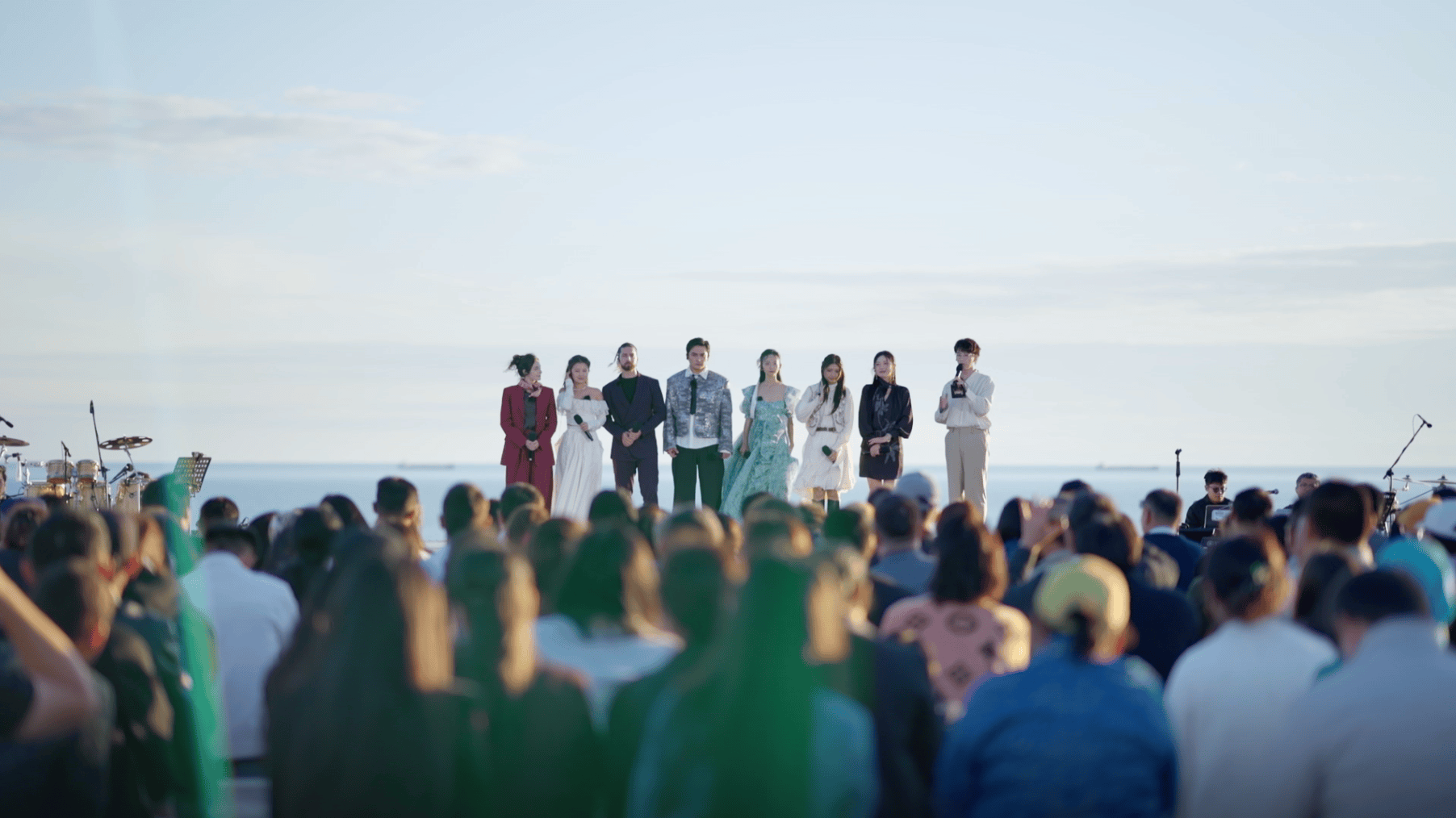 里海的碧波边上就是戈壁群山,中欧班列的汽笛和千年驼铃在同一个时空里回荡。节目组把舞台直接搭在了海边,歌手们背对波光粼粼的海面唱歌,海浪当背景音,晚风当和声——这种配置,演播厅里花钱也搭不出来。
